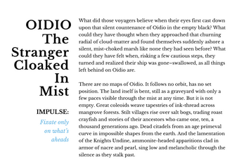 What did those voyagers believe when their eyes first cast down upon that silent countenance of Oidio in the empty black? What could they have thought when they approached that churning radial of cloud-matter and found themselves suddenly ashore a silent, mist-choked marsh like none they had seen before? What could they have felt when, risking a few cautious steps, they turned and realized their ship was gone–swallowed, as all things left behind on Oidio are.